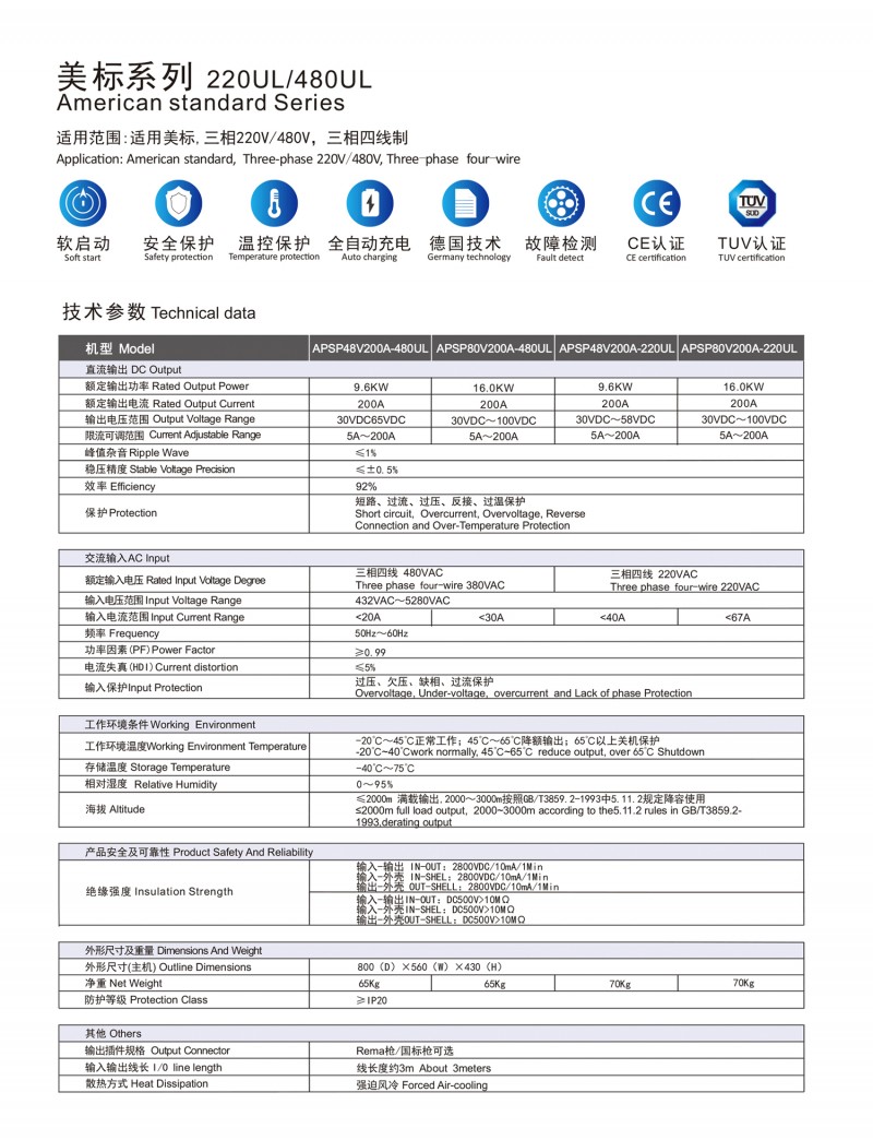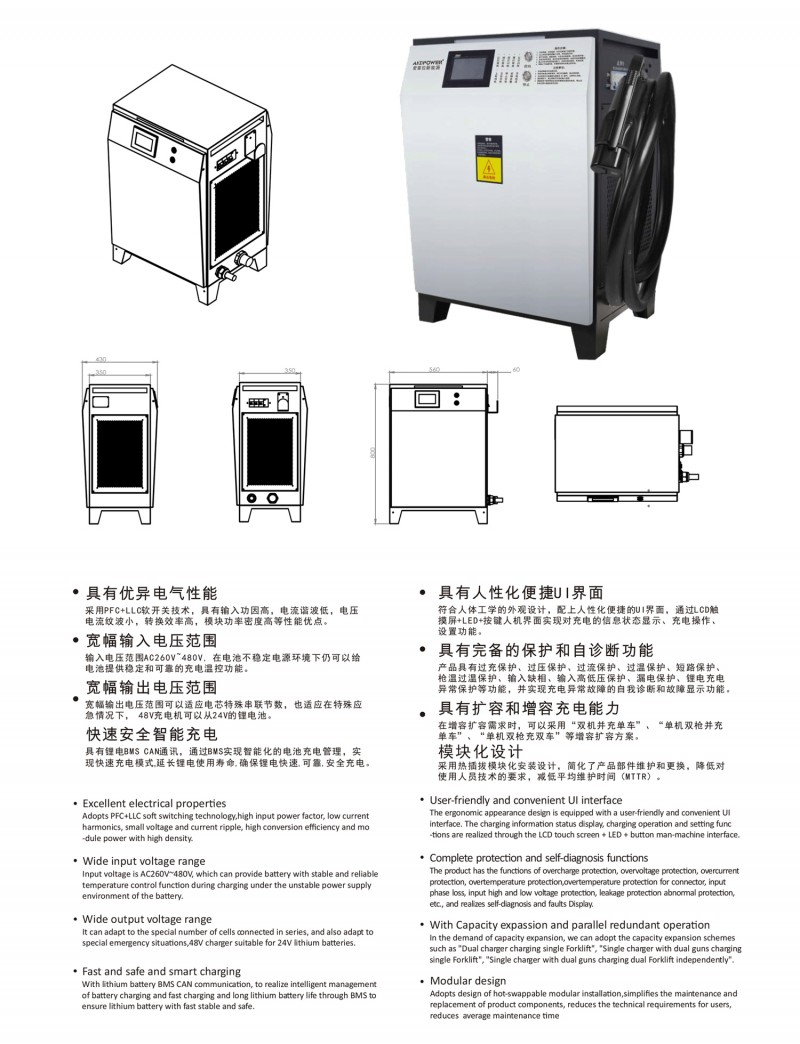 觸摸屏智能操作設計:告別傳統(tǒng)按鍵方式,給您帶來更現(xiàn)代更具科技智能的操作體驗 自動充電:插槍自動充電,簡化充電流程,便于操作 兼容性高:80V200A兼容48V200A充電 多重保護: 輸出短路,過流過壓保護,反接保護,電流導管保護等多重保護 預約充電功能:避開高峰用電時段,有效節(jié)省成本 雙語切換:中英文雙語隨需切換,跨越語言障礙,與世界接軌 人性化設計:充電機背板內部附部件明細及產品接線圖,方便客戶可更清楚的了解產品,便于維修,提高售后時效 獨特設計: 內置電磁鎖驅動模塊,防止臨時斷電鎖槍 使用壽命更長:功率模塊預留20%空間,提高模塊的使用壽命 出色內部結構: 內部結構左右出風,內部電路不容易積粉塵,提高充電機壽命