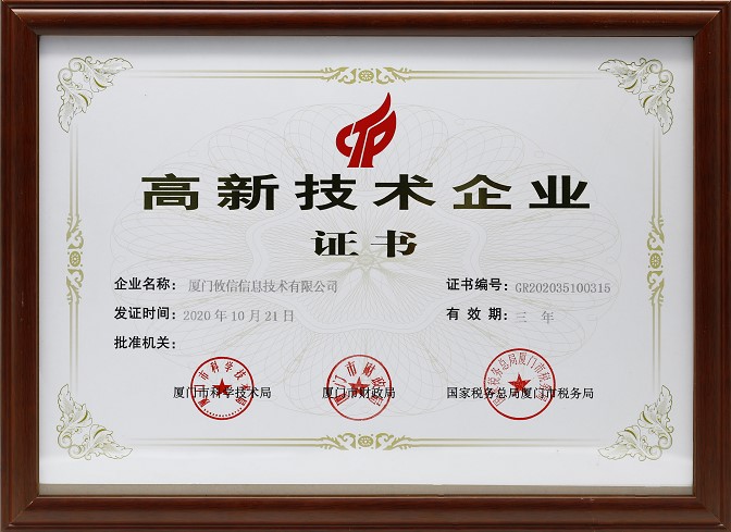 | 發(fā)證機(jī)構(gòu): | 廈門市科學(xué)技術(shù)局/廈門市財(cái)政局/國家稅務(wù)總局廈門市稅務(wù)局 | 發(fā)證時(shí)間 : | 2020-10-21 |