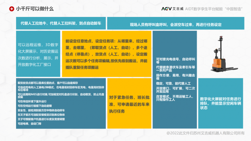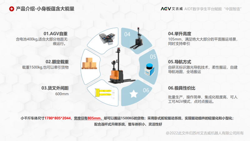 艾吉威機(jī)器人“小千斤”AGV,其設(shè)計(jì)特點(diǎn)手自一體多種模式,適用于物料多、載具不統(tǒng)一、配送作業(yè)繁忙、廠區(qū)面積大、配送距離遠(yuǎn)、物料員作業(yè)方式不統(tǒng)一的制造型企業(yè)。數(shù)字化大平臺(tái)免費(fèi)贈(zèng)送,應(yīng)用不斷免費(fèi)升級(jí),更加符合當(dāng)下“數(shù)實(shí)融合”、“智改數(shù)轉(zhuǎn)”的發(fā)展大勢(shì)。“小千斤”寓意千斤重?fù)?dān)小意思,大平臺(tái)寓意大數(shù)據(jù)平臺(tái)支撐,應(yīng)用功能免費(fèi)統(tǒng)一升級(jí)。