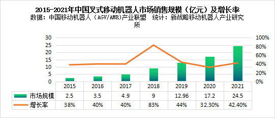 圖表:2015-2021年中國叉式移動機(jī)器人市場銷售規(guī)模(億元)及增長率