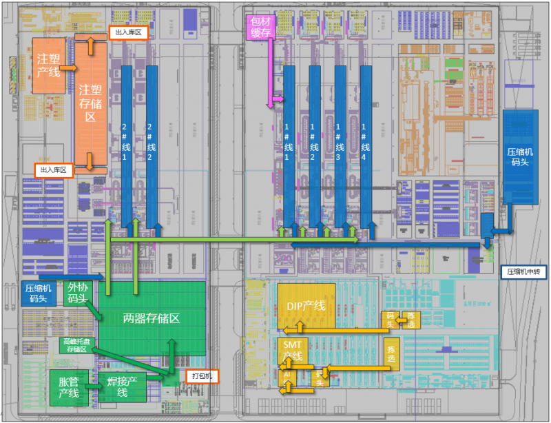 實(shí)現(xiàn)二器、注塑、電子、組裝等多個(gè)區(qū)域AMR自動(dòng)化轉(zhuǎn)運(yùn),實(shí)現(xiàn)柔性、跨多區(qū)域靈活、智能轉(zhuǎn)運(yùn);