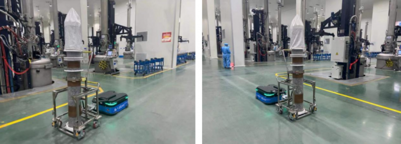 本次項(xiàng)目,用戶通過引入迦智科技涵蓋數(shù)十臺(tái)迦智全向AMR車隊(duì)和機(jī)器人調(diào)度管理系統(tǒng)CLOUDIA、物料管理系統(tǒng)MCS等在內(nèi)的整套智造物流解決方案,實(shí)現(xiàn)了1700度高溫的硅原料(毛棒)從2F拉晶爐到1F切斷機(jī)的自動(dòng)轉(zhuǎn)運(yùn)和暫存、上下料作業(yè)。