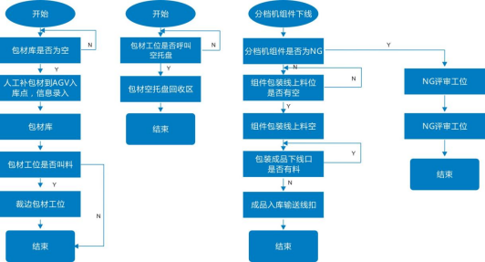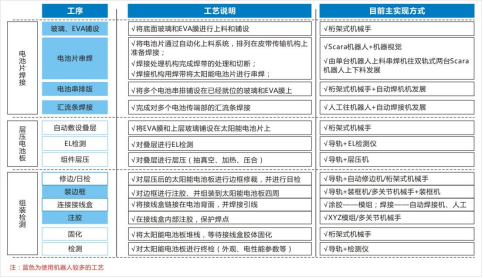 圖表:光伏行業(yè)關(guān)節(jié)機(jī)器人應(yīng)用現(xiàn)狀關(guān)節(jié)機(jī)器人主要運(yùn)用在了電池片焊接、排版、裝邊框、注膠等環(huán)節(jié),而移動(dòng)機(jī)器人主要用于不同工序之間的工序?qū)印?/span>在光伏行業(yè)生產(chǎn)線上,從上游到下游需要用到多種不同類型的AGV。一般會(huì)用到叉車AGV對(duì)冶金級(jí)別的硅礦(若原料為太陽(yáng)能級(jí)多晶硅材料,則采用潛伏頂升式AGV)等原材料進(jìn)行運(yùn)輸,將原料送上產(chǎn)線進(jìn)行裝料,在高純度石英干過中按層次裝入塊料、粉料、顆粒料、摻雜劑然后放入石墨坩堝合爐,再進(jìn)行抽空檢漏→壓力化→化料→引晶→縮頸→放肩→轉(zhuǎn)肩→等徑生長(zhǎng)→收尾、停爐的步驟。電池生產(chǎn)工藝環(huán)節(jié)空間適中,標(biāo)準(zhǔn)化程度高,規(guī)模較大。在傳統(tǒng)生產(chǎn)模式中有大量的工藝對(duì)接及半成品上下料搬運(yùn)對(duì)接由人工完成,在人員、流程管理、同步時(shí)效性上對(duì)用戶有一定困難及挑戰(zhàn):①生產(chǎn)現(xiàn)場(chǎng)要求24小時(shí)連續(xù)作業(yè),作業(yè)人員3班輪替,勞動(dòng)強(qiáng)度大,導(dǎo)致人員流動(dòng)性較大,企業(yè)管理成本劇增;②人工在生產(chǎn)設(shè)備前上料時(shí),雙手只能同時(shí)操作單個(gè)電池片載具依次上料,效率低下;③生產(chǎn)工藝復(fù)雜,對(duì)物料上料時(shí)的擺放、朝向、整齊度都有嚴(yán)格要求,要求作業(yè)人員低容錯(cuò)率和規(guī)范化作業(yè),如在太陽(yáng)能電池片生產(chǎn)過程中,有一道工序是將硅片插入花籃中,并將插滿硅片的花籃運(yùn)輸至其它工藝設(shè)備處,以進(jìn)行后續(xù)生產(chǎn)作業(yè)。為了將硅片準(zhǔn)確地插入花籃中,一般通過工作人員人工操作,一片一片地將硅片插入花籃中。此外,將插滿硅片的花籃運(yùn)輸至其它工藝設(shè)備處也是通過工作人員人工搬運(yùn)實(shí)現(xiàn)的。由于硅片本身具有薄、脆等特點(diǎn),因此,相關(guān)技術(shù)在將硅片插入花籃中時(shí),容易因?yàn)楣ぷ魅藛T力道不均而損壞硅片。④不同工藝環(huán)節(jié)之間由人工完成物料的搬運(yùn)與上料,中間環(huán)節(jié)物料信息缺失,異常原因難以追溯。為了解決傳統(tǒng)人工模式存在的種種問題,光伏廠商開始在電池片生產(chǎn)車間引進(jìn)AGV/AMR,實(shí)現(xiàn)從發(fā)料至下線,及生產(chǎn)中制絨、擴(kuò)散、激光、刻蝕、退火氧化、鍍膜、背膜、正膜、絲網(wǎng)印刷等工藝的對(duì)接搬運(yùn),實(shí)現(xiàn)硅料、硅片安全高效的自動(dòng)化轉(zhuǎn)運(yùn)。當(dāng)前,在電池片生產(chǎn)流程中,主要應(yīng)用的AGV/AMR車型有兩種,分體式與一體式AGV,分體式AGV是直接頂升貨架,再與自動(dòng)化設(shè)備或者主機(jī)臺(tái)工藝設(shè)備進(jìn)行對(duì)接,一體式AGV則是上方會(huì)有傳輸帶(如輥道等)配件,可直接作為生產(chǎn)線傳輸帶的一部分。玻璃原片上料—EVA裁切鋪設(shè)—自動(dòng)上模板—自動(dòng)串焊—自動(dòng)擺串—上背玻—EL測(cè)試單元—緩存堆棧—混進(jìn)定位單元—層壓機(jī)—混出定位單元—自動(dòng)修邊—翻轉(zhuǎn)檢查單元—自動(dòng)裝框—上料機(jī)—固化—清洗--下料機(jī)—絕緣耐壓測(cè)試—IV測(cè)試單元—自動(dòng)分檔—自動(dòng)包裝—自動(dòng)出入庫(kù)等。組件生產(chǎn)AGV自動(dòng)小車自動(dòng)按需運(yùn)輸流程大致流程如下:
