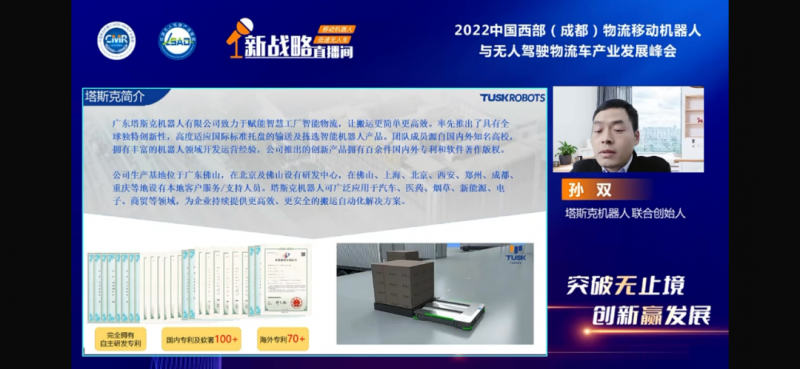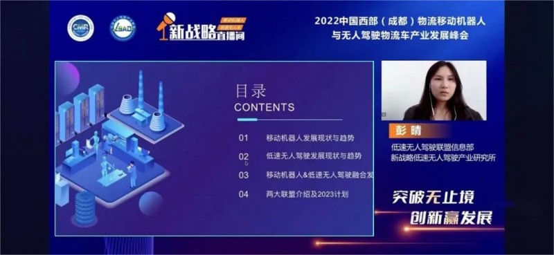 11月23日,由中國移動機(jī)器人(AGV/AMR)產(chǎn)業(yè)聯(lián)盟、低速無人駕駛產(chǎn)業(yè)聯(lián)盟、《物流搬運(yùn)機(jī)器人》雜志社、《低速無人車》雜志社、成都北辰中金展覽有限公司聯(lián)合主辦,新戰(zhàn)略移動機(jī)器人全媒體、 新戰(zhàn)略低速無人駕駛?cè)襟w協(xié)辦的2022中國西部(成都)物流移動機(jī)器人與無人駕駛物流車發(fā)展峰會在線上成功舉行!