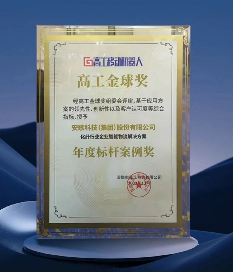2022年12月安歌科技的化纖解決方案憑借優(yōu)秀的團(tuán)隊配合度、創(chuàng)新的技術(shù)、杰出的集成能力,以及自研自產(chǎn)的硬件+軟件+系統(tǒng)+服務(wù)的創(chuàng)新集成模式,榮膺2022化纖行業(yè)企業(yè)智能物流解決方案 年度標(biāo)桿案例獎。