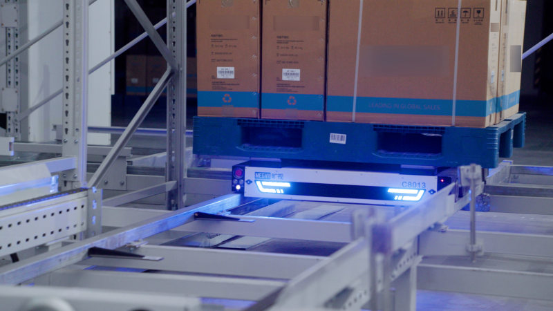 運(yùn)行于縫紉機(jī)成品“智能密集庫”中的曠視四向穿梭車