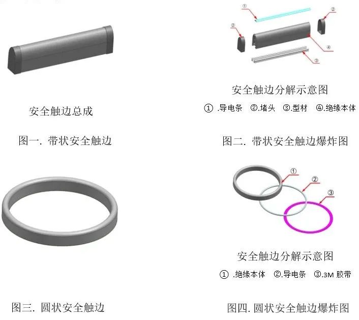 沃美諾方面介紹,以往安全觸邊大多以帶狀(見(jiàn)圖一,圖二)或圓狀 (圖三,圖四)安裝在升降機(jī)、安全門、機(jī)床工作臺(tái)、自動(dòng)無(wú)人小車、物流AGV小車、輪胎成型機(jī)等存在擠壓或剪切危險(xiǎn)的移動(dòng)部件邊棱上,安全觸邊被壓迫后傳遞信號(hào)給動(dòng)力源以停止部件運(yùn)動(dòng)。