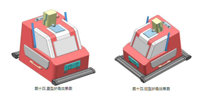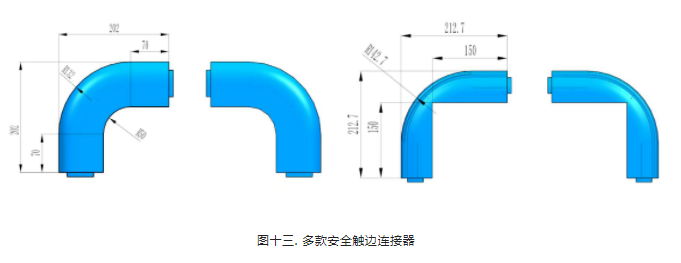 同時(shí)為了和客戶移動(dòng)部件更好地配合組裝安全觸邊,沃美諾一次性開(kāi)發(fā)了多款口型安全觸邊連接器(用的比較多的兩款口型見(jiàn)圖十二);以配合內(nèi)圓角分類,可分為直角連接器,R50連接器及R80連接器(見(jiàn)圖十三)。當(dāng)這三種連接器都無(wú)法達(dá)到客戶的完美要求時(shí),沃美諾還可根據(jù)客戶提供的安全觸邊安裝區(qū)域數(shù)據(jù)進(jìn)行個(gè)性化定制。