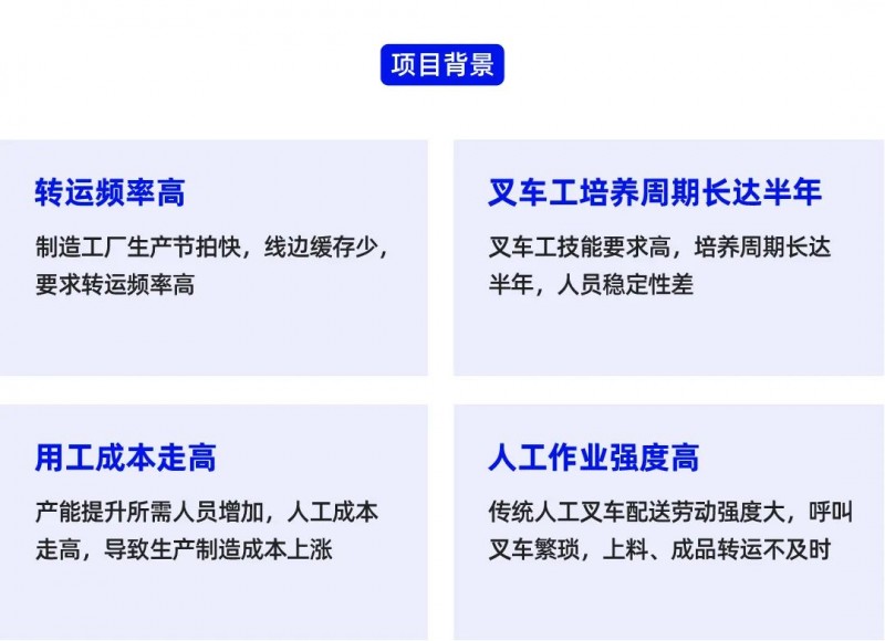 汽車行業(yè)生產(chǎn)制造節(jié)奏快,生產(chǎn)節(jié)拍緊湊,對場內(nèi)物流轉運頻率要求高。一個生產(chǎn)制造原料的延遲或將導致整個產(chǎn)線的停滯、延后,嚴重影響整個工廠的生產(chǎn)效率。