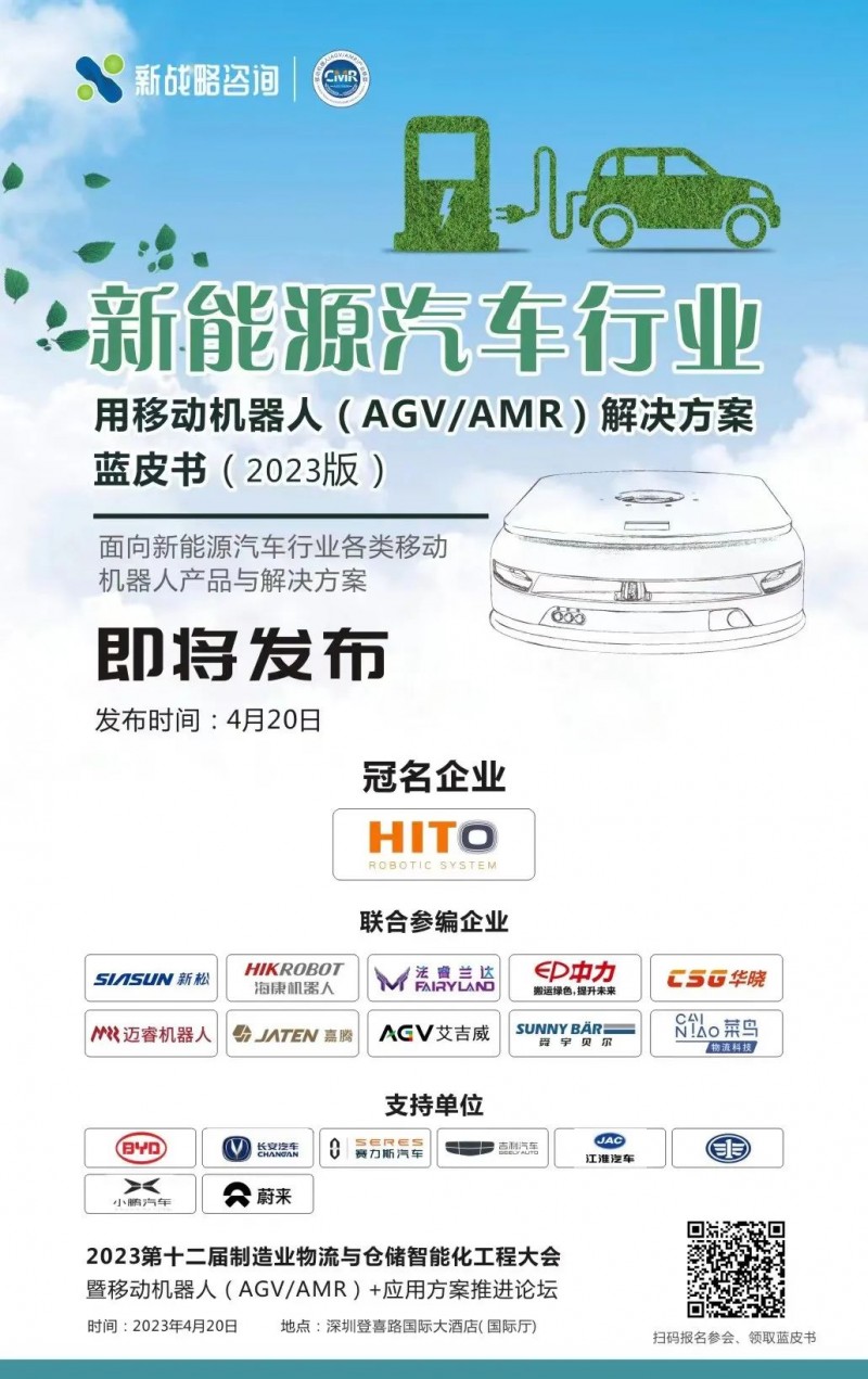 4月20日,在2023第十二屆制造業(yè)物流與倉儲智能化工程大會”上,《新能源汽車行業(yè)用移動機器人(AGV/AMR)解決方案藍皮書(2023版)》將正式發(fā)布!