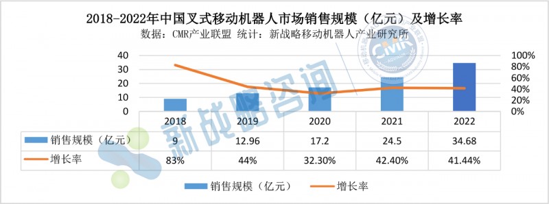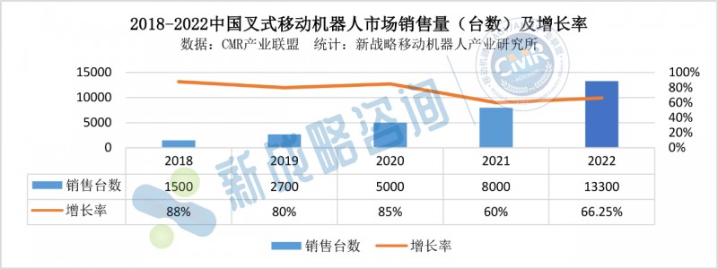 據(jù)CMR產(chǎn)業(yè)聯(lián)盟數(shù)據(jù)、新戰(zhàn)略移動(dòng)機(jī)器人產(chǎn)業(yè)研究所統(tǒng)計(jì),2022年中國叉式移動(dòng)機(jī)器人銷量達(dá)13300臺(tái),同比增長(zhǎng)66.25%,市場(chǎng)規(guī)模約為34.68億元,同比增長(zhǎng)41.55%。