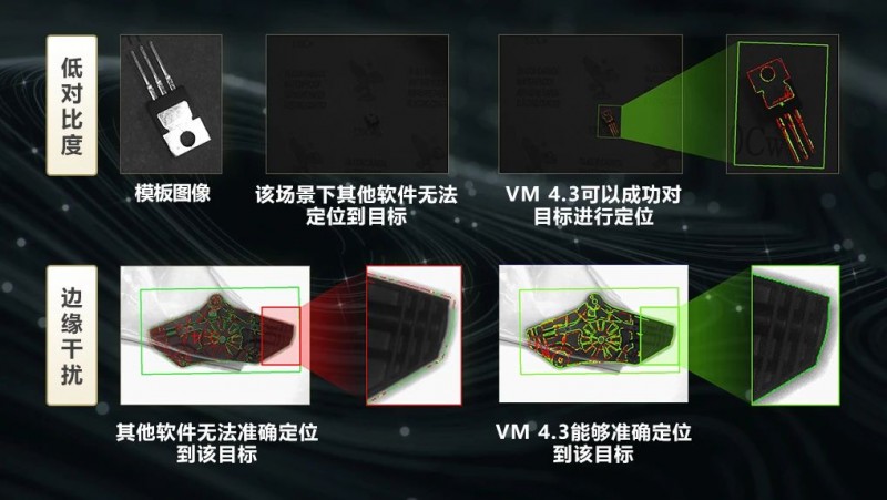 除了算法效率提升,VM4.3還進(jìn)一步優(yōu)化了算法性能。以模板匹配算法為例,通過(guò)采用更魯棒的邊緣定位技術(shù),在極低對(duì)比度及復(fù)雜邊緣干擾的情況下,VM4.3能夠精準(zhǔn)定位到目標(biāo)。