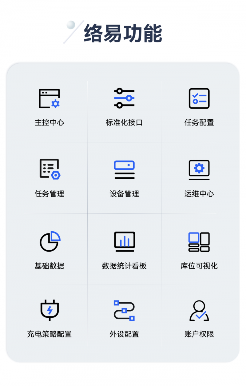 “小身板”體現(xiàn)在系統(tǒng)的輕量級,絡(luò)易支持10臺以內(nèi)多品牌AGV/AMR設(shè)備的選型和快速對接,輕量級的特點能大幅提升系統(tǒng)的快速部署能力,有效節(jié)約項目的實施運維成本。