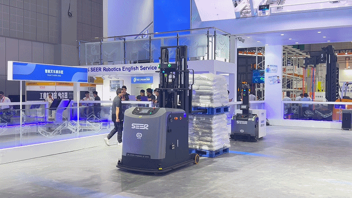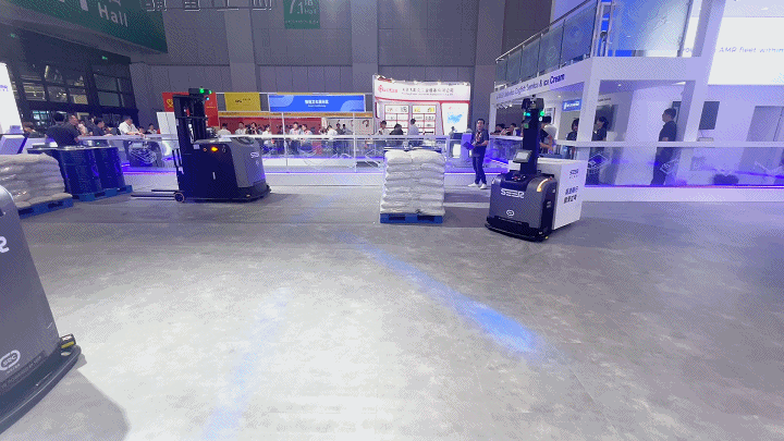 兩款今年新上市的智能叉車 SFL-CBD15 和 SFL-CDD16 在同一展區(qū)內(nèi)協(xié)同作業(yè),互為運行障礙物。兩車在保持最快 2m/s 的運行速度下依舊完美多次避讓,在避障激光、3D 避障相機、距離傳感器等多種傳感器的保護下實現(xiàn)高速暢行,順滑過彎,精準(zhǔn)避障,靈活繞行。