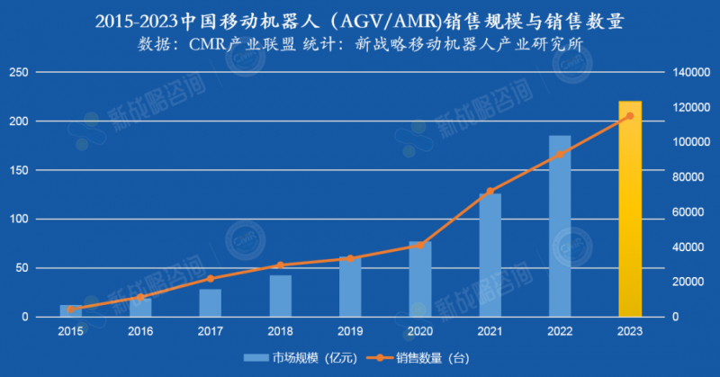 根據(jù)新戰(zhàn)略移動(dòng)機(jī)器人產(chǎn)業(yè)研究所初步測(cè)算,預(yù)計(jì)2023年中國(guó)移動(dòng)機(jī)器人(AGV/AMR)銷(xiāo)售規(guī)模約為220億,同比增長(zhǎng)18.9%;銷(xiāo)售數(shù)量約為115000臺(tái),同比增長(zhǎng)23.7%。