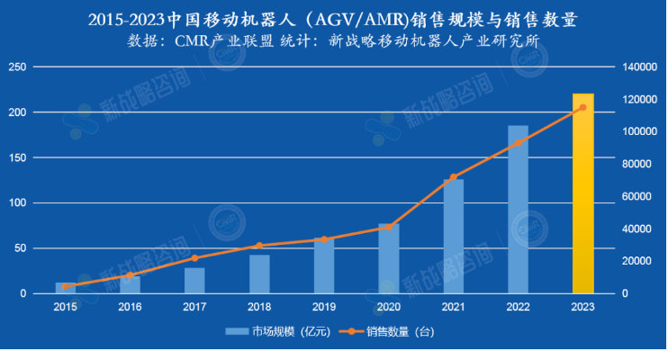 圖表:2015-2023中國(guó)AGV/AMR銷(xiāo)售數(shù)量與市場(chǎng)增長(zhǎng)率
