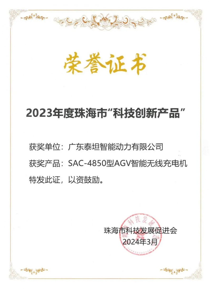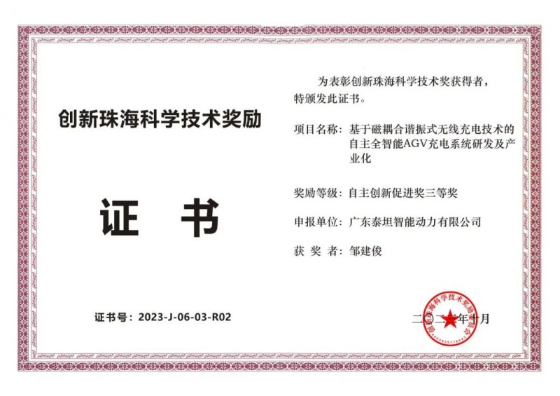 3月29日下午,“創(chuàng)新珠海”科技獎(jiǎng)暨科技創(chuàng)新評(píng)優(yōu)頒獎(jiǎng)典禮在珠海舉行。來(lái)自市科技創(chuàng)新局、市工業(yè)和信息化局、市民政局、市科協(xié)等有關(guān)部門負(fù)責(zé)人,企業(yè)、高校、科研院所和社會(huì)組織代表共計(jì)200余人參會(huì)。廣東泰坦智能動(dòng)力有限公司憑借其基于磁耦合諧振式無(wú)線充電技術(shù)的自主全智能AGV充電系統(tǒng)研發(fā)及產(chǎn)業(yè)化項(xiàng)目獲得了2023年度珠??茖W(xué)技術(shù)獎(jiǎng)-自主創(chuàng)新促進(jìn)獎(jiǎng)三等獎(jiǎng)以及2023年度珠海市科技創(chuàng)新產(chǎn)品獎(jiǎng)。
