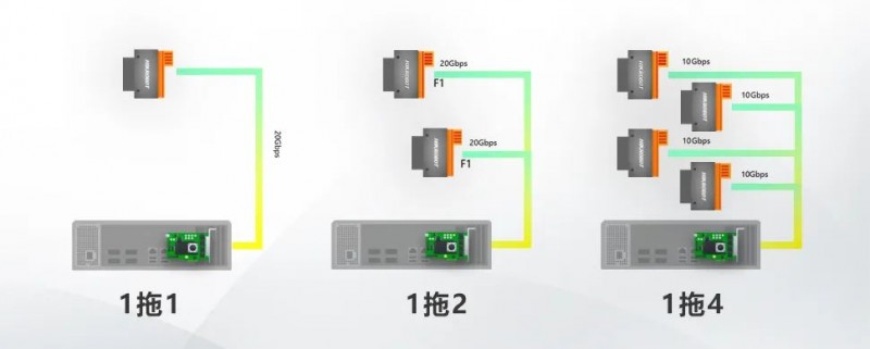??禉C(jī)器人推出了不同XoFlink接口數(shù)量的配套采集卡,搭配相機(jī)自身支持的1link和2link兩種工作模式,可支持1拖1、1拖2、1拖4等多種連接方式,安裝便捷??蛻艨筛鶕?jù)對行頻及整套方案的架設(shè)需求靈活選擇拓?fù)溥B接模式。