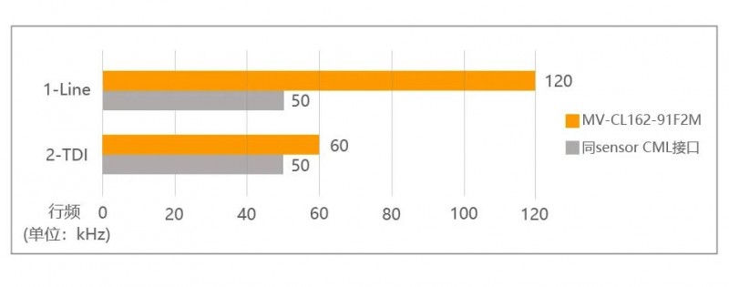 相機(jī)(MV-CL162-91F2M)采用兩線COMS Sensor,支持2-TDI成像,且在開啟2-TDI后可保持60kHz行頻高速采集,兼顧高速采集和亮度提升,降低視覺系統(tǒng)對環(huán)境光源的要求。