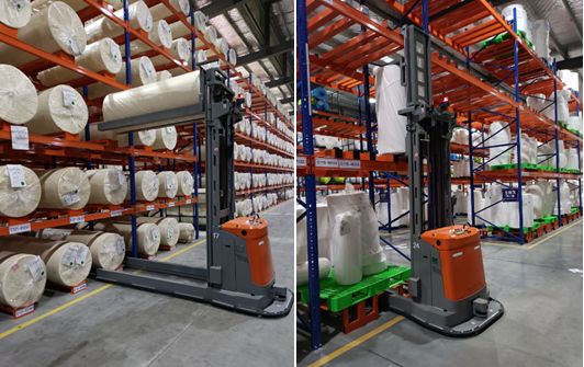 該項目共投入使用59臺今天國際定制化AGV,包括三類38臺激光導(dǎo)航叉車AGV和21臺二維碼導(dǎo)航的潛伏頂升式AGV,59臺AGV共同運行在同一個車間里,協(xié)同工作,互不干擾。AGV系統(tǒng)在不同車型的車輛管理上實現(xiàn)了完美融合,真正做到了智慧物流。AGV應(yīng)用場景包括原料、蛋糕卷、成品無人化、智能化精準(zhǔn)搬運,實現(xiàn)了在高層貨架的上下架自動搬運、平面?zhèn)}庫的自動搬運、以及半成品到使用車間的自動配送。