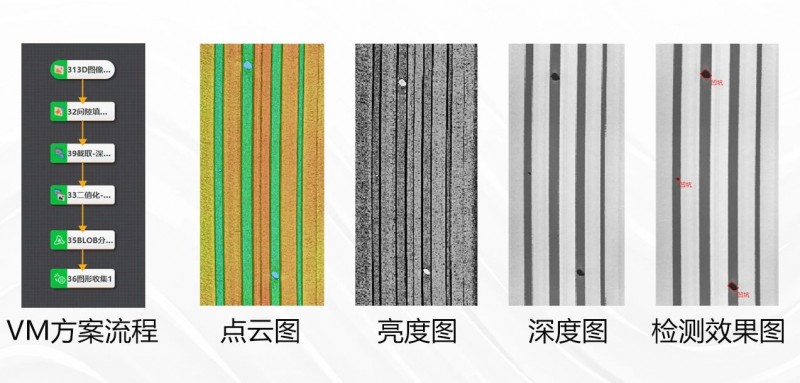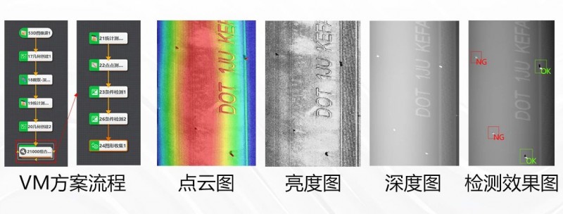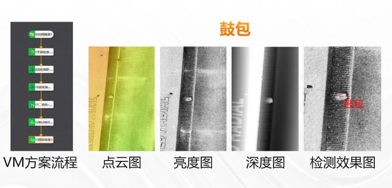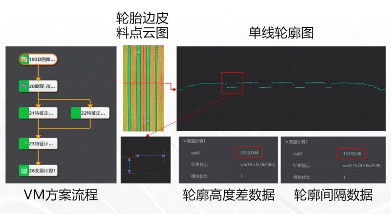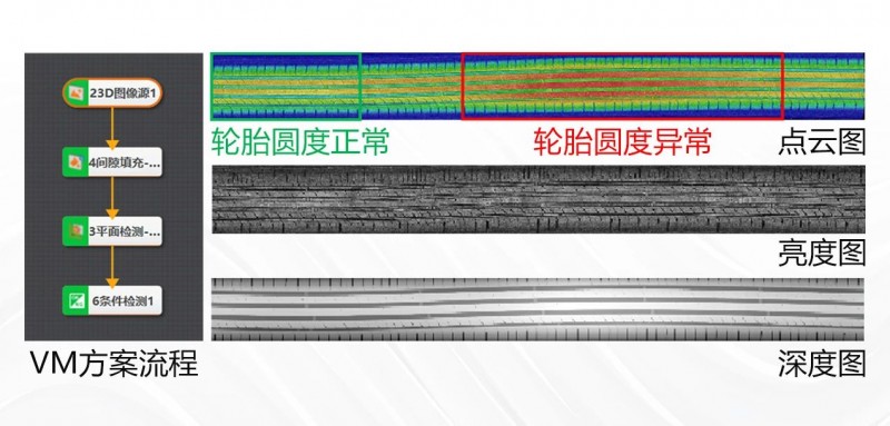 下圖展示了3D激光輪廓傳感器對(duì)輪胎胎毛的實(shí)際采集效果及VM檢測(cè)方案。