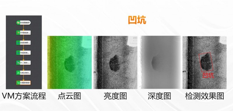 3D激光輪廓傳感器可有效識(shí)別缺陷、同時(shí)滿足生產(chǎn)節(jié)拍要求,完成全面檢測(cè)僅需旋轉(zhuǎn)一周。如下展示了鼓包、凹坑的實(shí)際測(cè)試圖像。