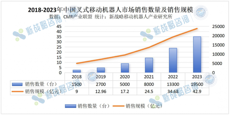 圖表:2018-2023年中國叉式移動機器人市場銷售數(shù)量及銷售規(guī)模