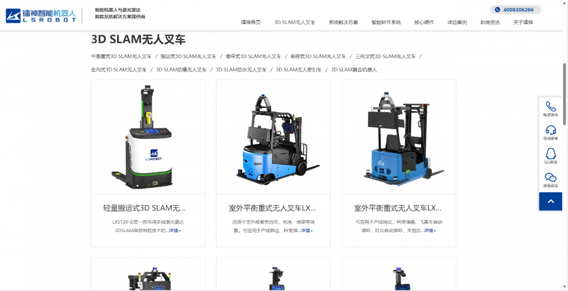 官網(wǎng)精心設(shè)計了3D SLAM無人叉車系列產(chǎn)品矩陣展示區(qū),從輕量搬運(yùn)式到前移式,再到室外平衡重式無人叉車,全方位覆蓋不同行業(yè)、不同場景的需求。