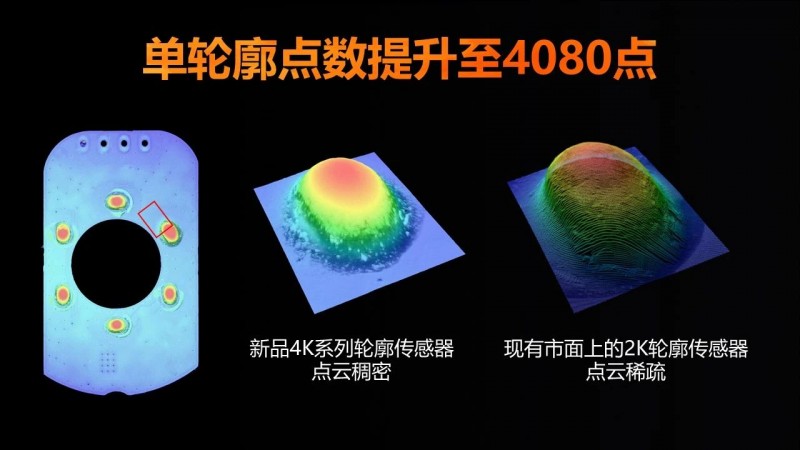 新一代3D激光輪廓傳感器的單輪廓點(diǎn)數(shù)提升至4080點(diǎn),相比2K分辨率產(chǎn)品,在相同測(cè)量范圍下的X軸分辨率提升接近2倍,使輪廓傳感器能夠更好地捕捉復(fù)雜表面特征,如凹陷、突起和反光表面。通過(guò)FPGA硬件加速,最高掃描幀率提升至49KHz,使相機(jī)能更好地滿足現(xiàn)代高速生產(chǎn)線的需求,確保在高速度下仍能保持高精度的測(cè)量,為高精度、高速率測(cè)量的檢測(cè)場(chǎng)景提供更高效的解決方案。
