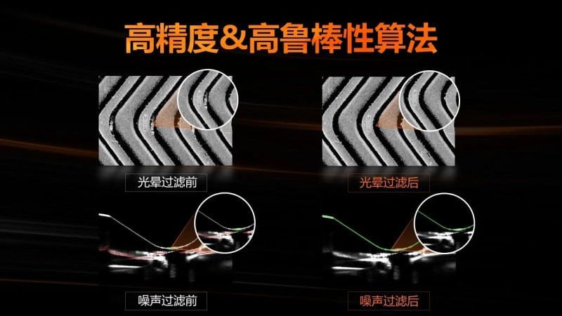 新一代3D激光輪廓傳感器內(nèi)置全面升級(jí)的視覺算法,超高亞像素算法精度可達(dá)1/16像素。多幀圖像融合技術(shù)使輪廓數(shù)據(jù)提取更加完整,光暈過(guò)濾和連續(xù)性濾除可以有效降低反光干擾的影響,提升算法在不同應(yīng)用場(chǎng)景下的魯棒性。