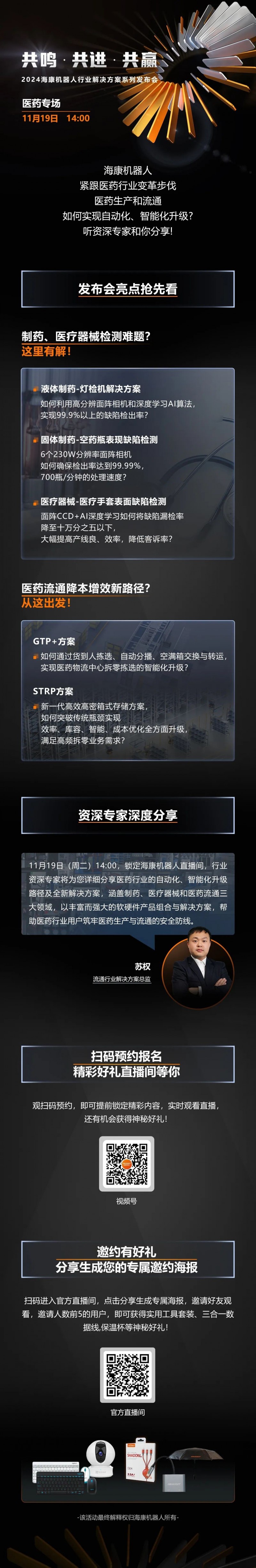 11月19日(周二)14:00,海康機(jī)器人資深專家將帶來醫(yī)藥行業(yè)創(chuàng)新解決方案分享并進(jìn)行實(shí)時(shí)答疑,分享官方直播間邀約海報(bào)、觀看直播、填寫問卷更有機(jī)會(huì)贏取多種精美好禮,即刻點(diǎn)擊下方按鈕預(yù)約吧!