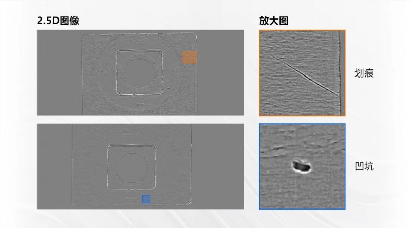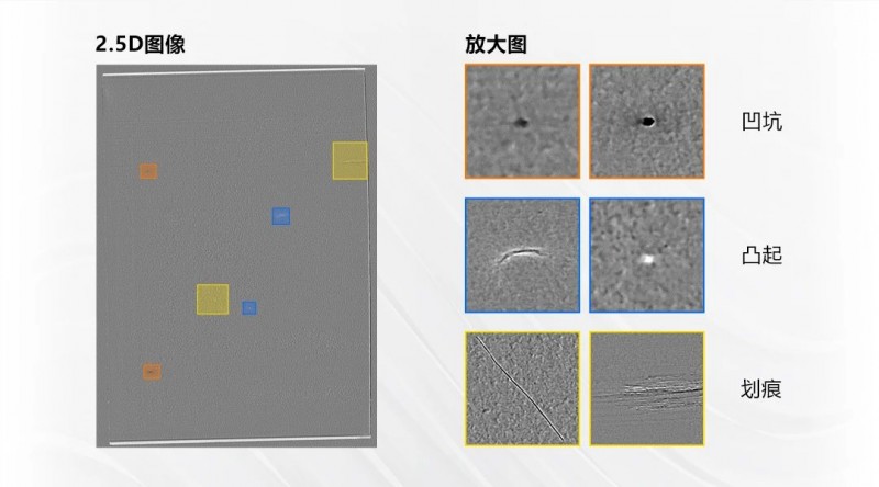 檢測(cè)效果:去除覆膜表面顏色和反光影響,有效檢出微小缺陷,對(duì)有無高度變化的缺陷進(jìn)行區(qū)分