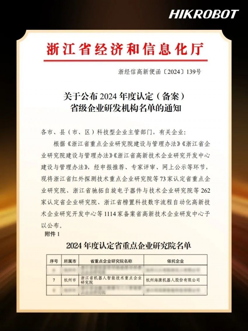 近日,浙江省經(jīng)濟(jì)和信息化廳發(fā)布《關(guān)于2024年度認(rèn)定(備案)省級(jí)企業(yè)研發(fā)機(jī)構(gòu)名單的通知》,其中??禉C(jī)器人“浙江省機(jī)器人智能技術(shù)重點(diǎn)企業(yè)研究院”成功通過(guò)浙江省經(jīng)濟(jì)和信息化廳的審核、評(píng)審及公示等環(huán)節(jié),被認(rèn)定為“浙江省重點(diǎn)企業(yè)研究院”。