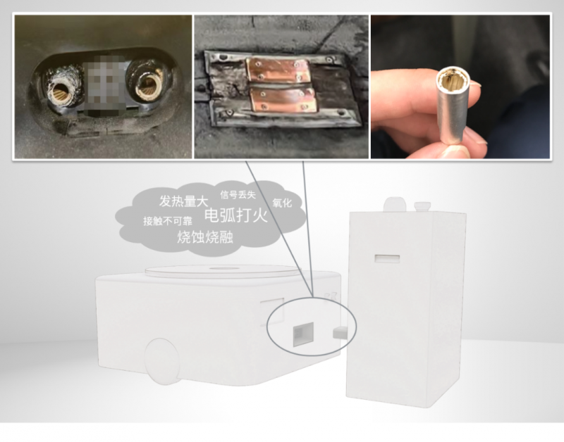 移動(dòng)機(jī)器人(AGV/AMR)與穿梭車等自動(dòng)化物流設(shè)備需要頻繁充電來(lái)實(shí)現(xiàn)高效運(yùn)轉(zhuǎn),因此充電環(huán)節(jié)成為潛在風(fēng)險(xiǎn)點(diǎn)。全球知名工商業(yè)保險(xiǎn)公司 FM Global 在財(cái)產(chǎn)防損數(shù)據(jù)冊(cè)《8-34 Protection for Automatic Storage and Retrieval Systems》中強(qiáng)調(diào),AS/RS 系統(tǒng)的安全防護(hù)要著重防范充電接觸點(diǎn)出現(xiàn)電弧發(fā)熱等風(fēng)險(xiǎn)。移動(dòng)機(jī)器人頻繁充電時(shí),若充電連接器無(wú)法適應(yīng)高插拔工況,隨著插拔次數(shù)增加,連接器表面磨損加劇,鍍層和基材受損,接觸電阻上升。磨損到一定程度發(fā)生接觸失效,接觸電阻會(huì)急劇增大,引發(fā)高溫發(fā)熱,帶來(lái)電氣安全風(fēng)險(xiǎn)。在終端現(xiàn)場(chǎng),充電故障常表現(xiàn)為無(wú)法充電、電弧打火、連接器燒毀等,這不僅降低物流效率,還帶來(lái)重大安全隱患。在鋰電、光伏、半導(dǎo)體等火災(zāi)防控要求極高的行業(yè),這類故障必須嚴(yán)格防范,否則極易引發(fā)嚴(yán)重后果。