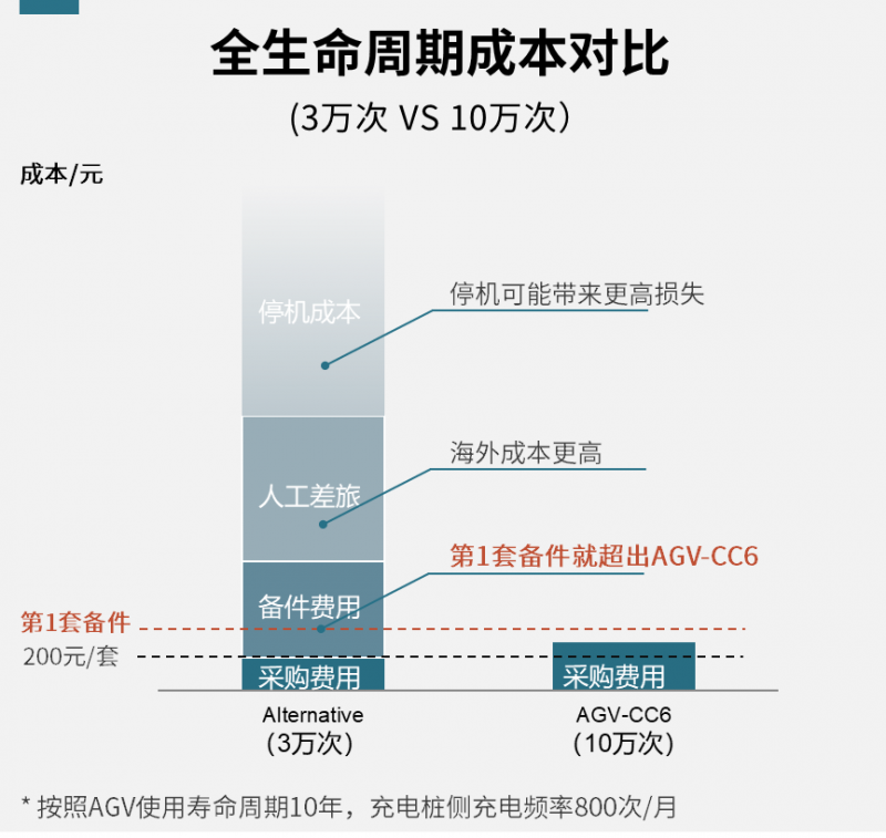 在移動(dòng)機(jī)器人的全生命周期內(nèi),與3萬(wàn)次插拔壽命的連接器相比,史陶比爾AGV-CC6連接器憑借高達(dá)10萬(wàn)次的插拔壽命,展現(xiàn)出了更為顯著的成本效益。具體而言,使用 AGV-CC6,10年內(nèi)僅需承擔(dān)首次采購(gòu)成本;競(jìng)品更換第一套備件后,累積成本就已遠(yuǎn)超AGV-CC6,還不包括其產(chǎn)生的大量人工成本和生產(chǎn)停機(jī)成本。此外,史陶比爾也在持續(xù)推進(jìn)本地化降本,使得AGV-CC6性價(jià)比更具優(yōu)勢(shì)。