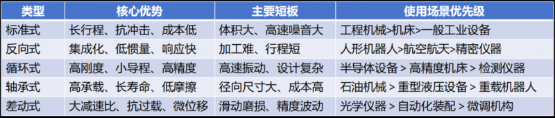 經(jīng)過長期發(fā)展,行星滾柱絲杠已演化出多個(gè)結(jié)構(gòu)變體,在傳動(dòng)效率、承載能力、尺寸適配等方面形成各具優(yōu)勢的類型。其中,通過對(duì)不同結(jié)構(gòu)形式的性能對(duì)比與工程適配性分析,目前在人形機(jī)器人領(lǐng)域得到廣泛采用的是“反向式”行星滾柱絲杠結(jié)構(gòu)。