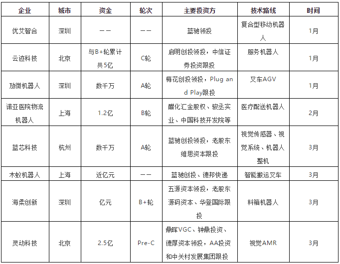 一季度,產(chǎn)品型公司開始集中爆發(fā),展露頭角。先后都拿到了資本方大小不等的融資,市場(chǎng)推進(jìn)開始加快。例如海柔創(chuàng)新、優(yōu)艾智合、未來(lái)機(jī)器人等。經(jīng)過(guò)前期的發(fā)展,這些產(chǎn)品公司的相關(guān)產(chǎn)品已經(jīng)得到了市場(chǎng)驗(yàn)證,開始進(jìn)入成熟期,加上資本助力,市場(chǎng)拓展由此開始加速。