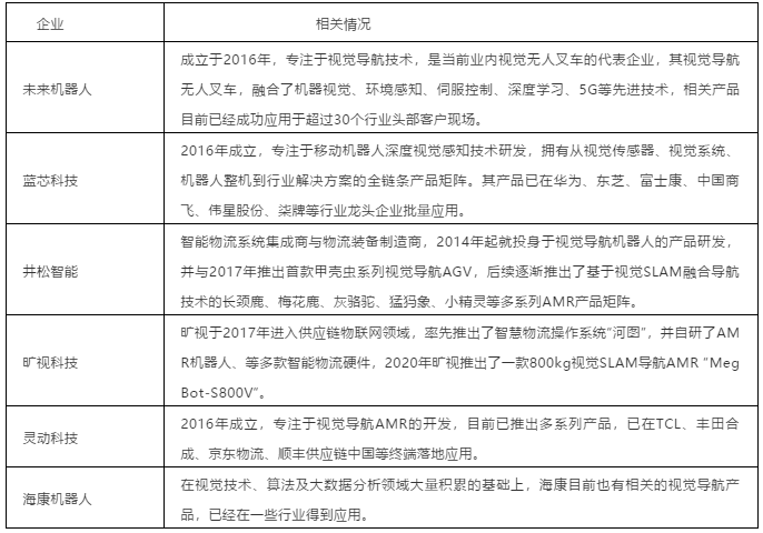 圖表:國內(nèi)主流視覺導(dǎo)航AGV/AMR廠商(本表粗略統(tǒng)計(jì),如有未完善之處,請指正!)