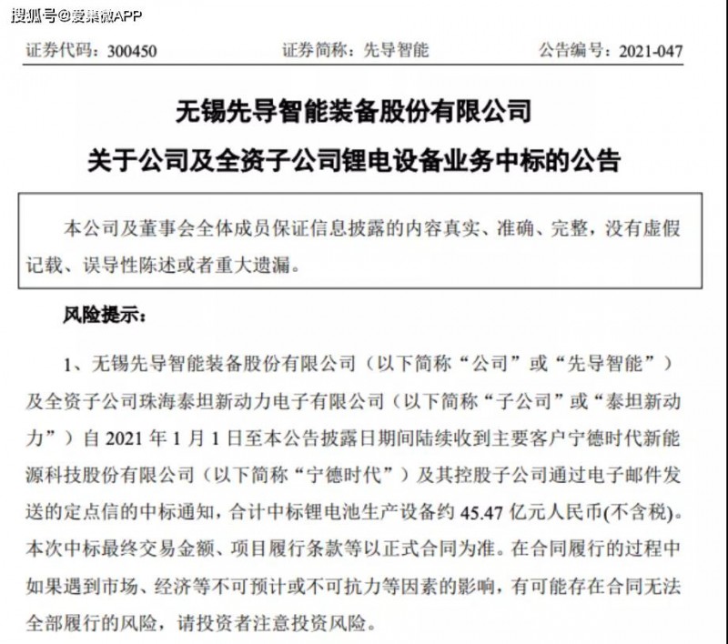 5月31日晚間,無錫先導(dǎo)智能裝備股份有限公司(簡稱“先導(dǎo)智能”)發(fā)布公告稱,先導(dǎo)智能及全資子公司泰坦新動力自2021年1月1日至公告披露日期間陸續(xù)收到主要客戶寧德時代新能源科技股份有限公司(以下簡稱“寧德時代”)及其控股子公司通過電子郵件發(fā)送的定點(diǎn)信的中標(biāo)通知,合計中標(biāo)鋰電池生產(chǎn)設(shè)備約45.47億元人民幣。