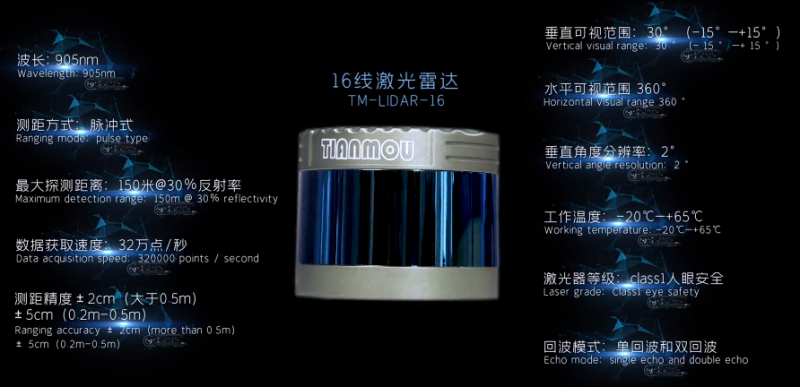 TM-LIDAR-16是一款16線機械式激光雷達,最大探測距離是150米,垂直可視范圍是30°,水平可視范圍為360°,垂直角度分辨率為2°。
