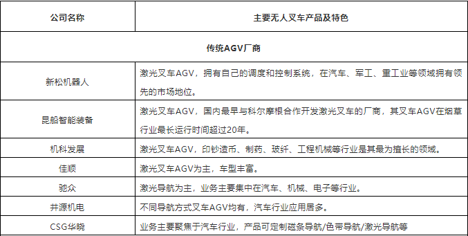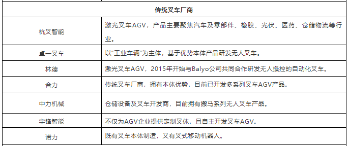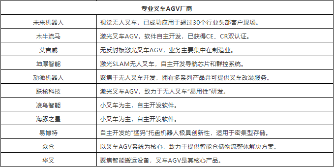 表:中國(guó)市場(chǎng)40+叉車AGV企業(yè)(排名不分先后,企業(yè)分類以其主營(yíng)業(yè)務(wù)為依據(jù))