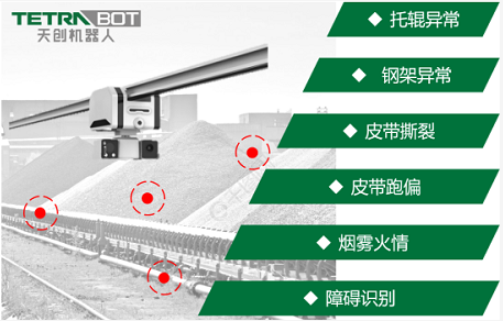 通過機器人搭載采集高清視頻圖像,利用巡檢AI算法,有效判斷皮帶跑偏,表面撕裂,路面灑落礦渣等設備故障或生產(chǎn)事故,并將告警信息及時反饋至控制中心,由工作人員及時進行處理。