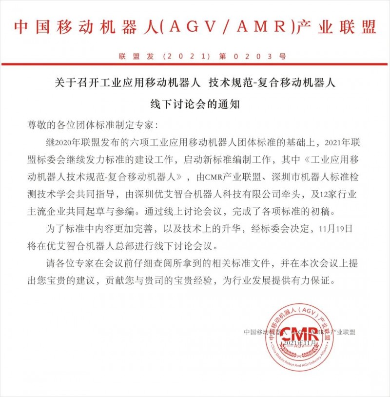 關(guān)于召開《工業(yè)應(yīng)用移動(dòng)機(jī)器人 技術(shù)規(guī)范-復(fù)合移動(dòng)機(jī)器人》線下討論會(huì)的通知