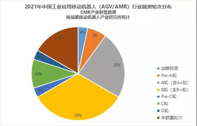 從融資輪次看,2021年工業(yè)應用移動機器人領域,戰(zhàn)略融資1起,占比為4%;Pre-A輪2起,占比7%;A輪(含A+輪)7起,占比23%;B輪(含B+輪)10起,占比33%;Pre-C輪1起,占比3%;C輪3起,占比10%,D輪1起,占比3%;5起未披露輪次,占比17%。