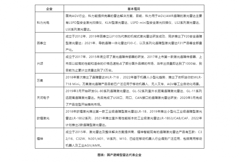 近幾年,伴隨著AGV/AMR整體市場及激光導(dǎo)航AGV/AMR發(fā)展,賽道內(nèi)的激光雷達(dá)廠商開始不斷增多。尤其是國產(chǎn)企業(yè),經(jīng)過長久的打磨,其穩(wěn)定性和可靠性獲得了快速發(fā)展,在相關(guān)技術(shù)方面也有了一定的突破,尤其是避障雷達(dá),由于技術(shù)要求與導(dǎo)航雷達(dá)相比相對較低,目前國內(nèi)廠商大部分在避障領(lǐng)域都已經(jīng)漸趨成熟。