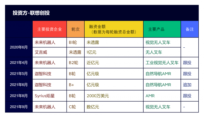 2020年至2021年,聯(lián)想創(chuàng)投在移動(dòng)機(jī)器人行業(yè)參與了7起融資事件,被投企業(yè)包括未來(lái)機(jī)器人、艾吉威、迦智科技、Syrius炬星。